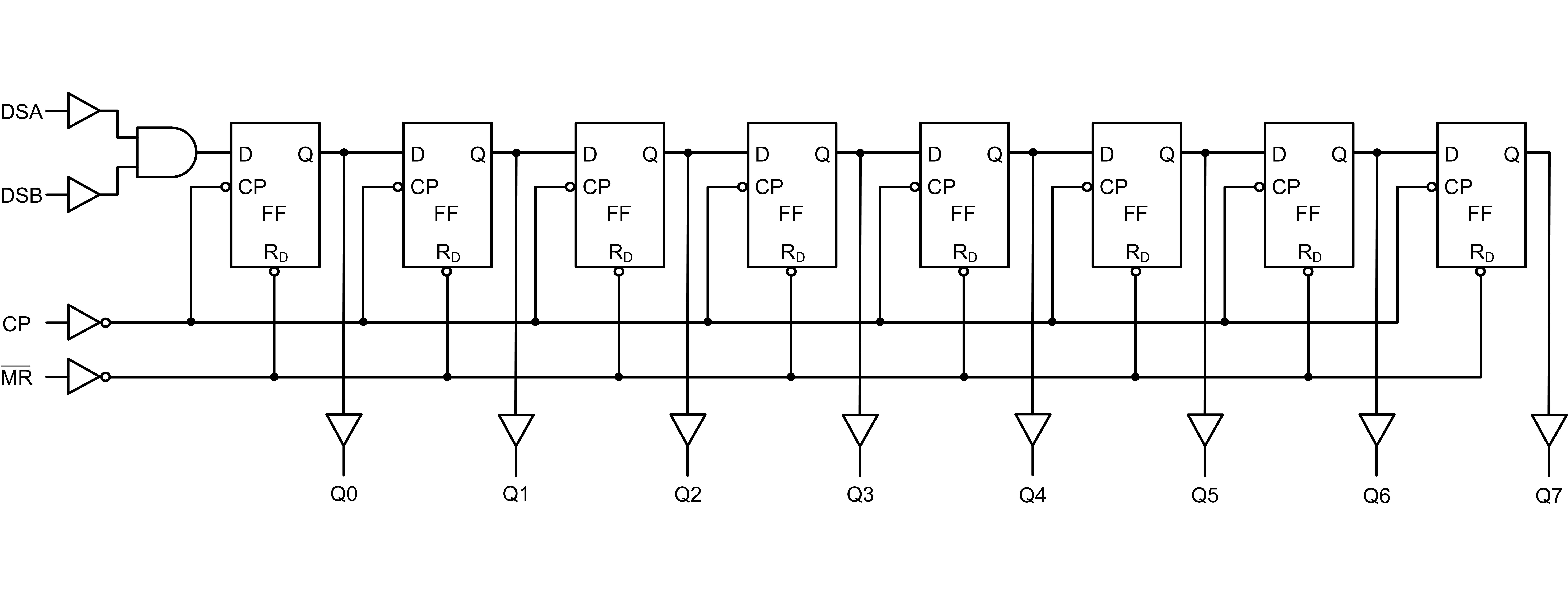該設(shè)備具有兩個(gè)串行數(shù)據(jù)輸入(DSA和DSB),八個(gè)并行數(shù)據(jù)輸出(Q0到Q7)。輸入(DSA和DSB)允許對傳入數(shù)據(jù)進(jìn)行完全控制。任何一個(gè)輸入端的低電平都會阻值新數(shù)據(jù)的輸入,并在下一個(gè)時(shí)鐘(CP)脈沖時(shí)將第一個(gè)觸發(fā)器重置為低電平。主復(fù)位輸入 (MR)上的低電平清除寄存器并強(qiáng)制所有輸出為低電平,與其他輸入無關(guān)。
